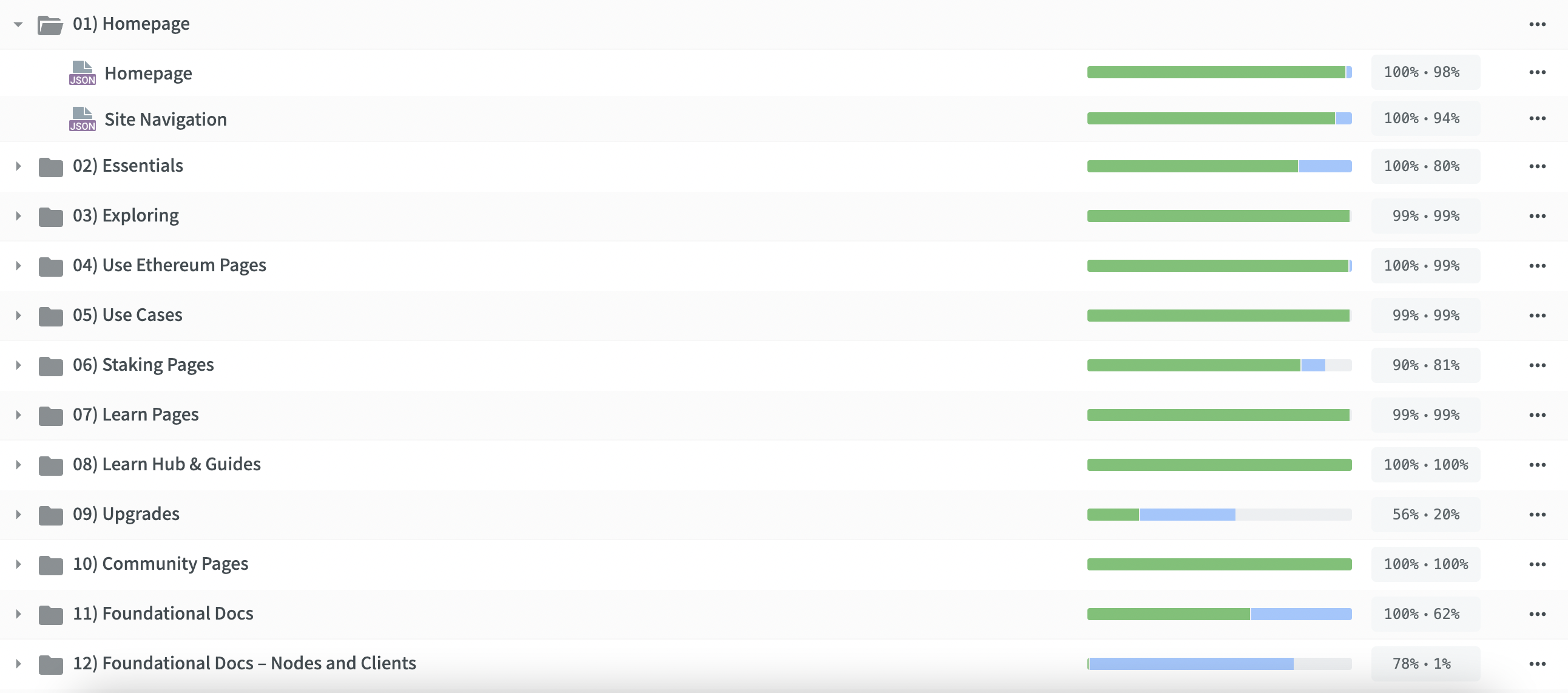 The website content is divided into a number of documents and content buckets. You can check the progress of each document on the right – if translation progress is below 100%, please contribute!